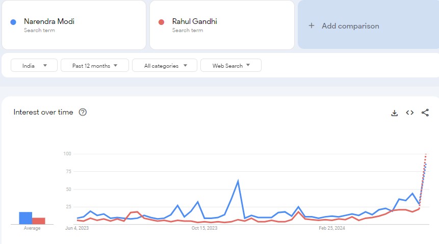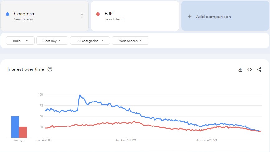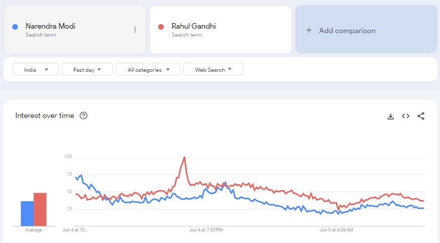 इसके अलावा 4 जून को गूगल सर्च पर लोगों ने राहुल गांधी को प्रधानमंत्री नरेंद्र मोदी से ज्यादा बार सर्च किया।