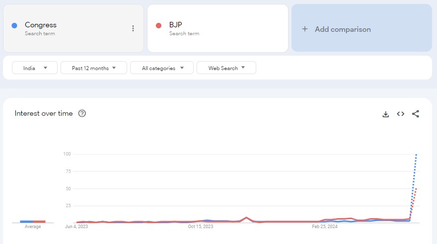 कल का दिन भारत और उसके नागरिकों के लिए बहुत खास था क्योंकि कल 2024 इलेक्शन के रिजल्ट आए हैं। जिस तरह से इलेक्शन रिजल्ट में भाजपा पर कांग्रेस का दबाव दिखा उसी तरह गूगल सर्च पर भी कल के दिन कांग्रेस और राहुल गांधी आगे रहे हैं। यहां हम आपको ग्राफ के जरिए कल की स्थिति से अवगत कराएंगे।