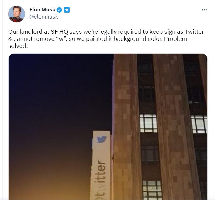 इनता ही नहीं, एलन मस्क ने ट्विटर साइन बदलने की इस पिक्चर को अपने ट्विटर अकाउंट पर पोस्ट भी किया है। इस पिक्चर के साथ, एलन मस्क ने एक कैप्शन जोड़ा है, “Our landlord at SF HQ says we're legally required to keep the sign as Twitter and cannot remove “w”, so we painted its background colour. Problem solved.”