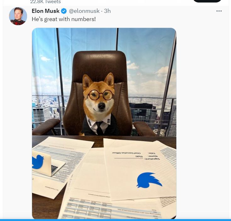 इसके ठीक बाद, मस्क ने दूसरा पोस्ट शेयर किया है। नए पोस्ट में डॉग के आगे ट्विटर के कुछ डॉक्यूमेंट नजर आ रहे हैं। हालांकि, यहां ट्विटर के नए बॉस का नाम Floki भी नजर आता है। मालूम हो कि एलन मस्क ने पिछले दिनों ट्विटर पर अपना नाम भी बदल दिया था। हालांकि, बाद में इसे ठीक भी कर लिया था।