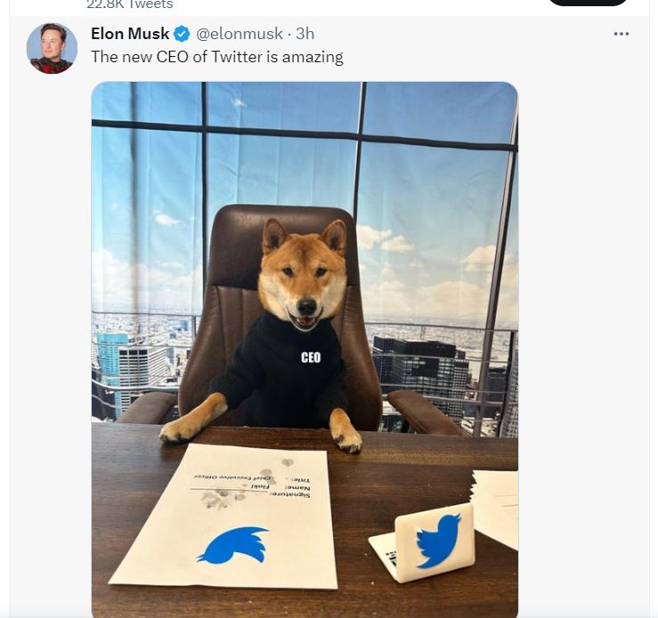 दरअसल ट्विटर सीईओ एलन मस्क ने एक ट्वीट शेयर किया है। इस ट्वीट में उनकी सीईओ की कुर्सी कोई और ही संभाले नजर आ रहा है। इस कुर्सी पर एलन मस्क ने एक डॉग को बैठाया है। यही नहीं ट्विटर सीईओ ने डॉग को सीईओ की नई पहचान देते हुए एक ब्लैक टीशर्ट भी पहनाया है, जिस पर सीईओ भी लिखा हुआ है।