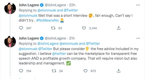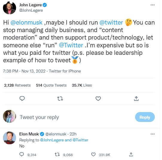 ट्विटर पर पोस्ट की गई अपनी नौकरी की पिच में लेगेरे ने लिखा है कि हाय @ एलन मस्क, शायद मुझे @ट्विटर चलाना चाहिए। आप दैनिक व्यवसाय, और" कंटेंट मॉडरेशन "का मैनेजमेंट करना बंद कर सकते हैं और फिर प्रोडक्ट/ टेक्नोलॉजी का सपोर्ट कर सकते हैं, किसी और को ट्विटर चलाने दें । बता दें कि उनका ट्वीट ट्विटर के $44 बिलियन बायआउट के बारे में था। लेकिन मस्क ने इसपर अपने एक शब्द के जवाब में "नहीं” कहा।