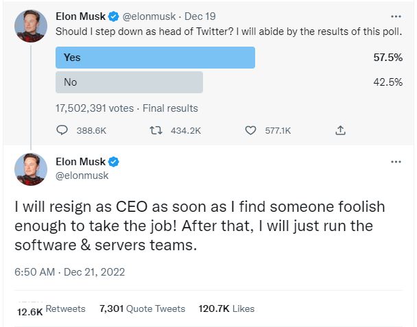 इस पोल के रिजल्ट के बाद मस्क ने आज सुबह यानी 21 दिसंबर को इस पोल के रिजल्ट के जवाब में ट्विटर पर ही एक पोस्ट किया। इस पोस्ट पर उन्होंने ट्वीट करके लिखा कि जैसे ही मुझे कोई 'मूर्ख' (Foolish) मिलेगा जो काम ले सकेगा, मैं CEO के पद से इस्तीफा दे दूंगा! उसके बाद, मैं सिर्फ सॉफ्टवेयर और सर्वर टीमों को चलाऊंगा।