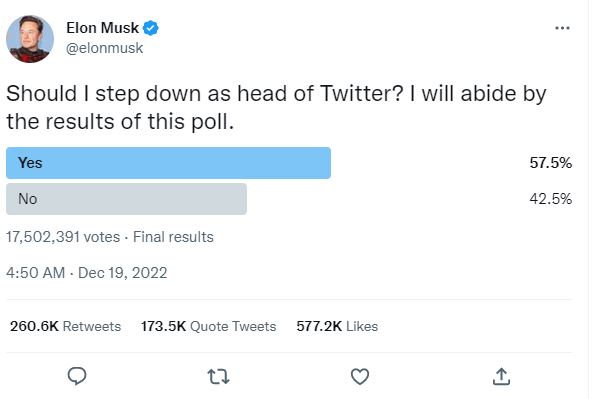 मस्क ने बीते सोमवार यानी 19 दिसंबर को एक पोल क्रिएट किया था, जिसमें उन्होंने लोगों से ये पूछा था कि क्या उनको ट्विटर के CEO के पद को छोड़ देना चाहिए। इसके जवाब के तौर पर लोगों ने उनको पद छोड़ने को कहा है। Elon Musk ने पोस्ट में लिखा कि क्या मुझे ट्विटर के प्रमुख के रूप में पद छोड़ना चाहिए? मैं इस पोल के परिणामों का पालन करूंगा।