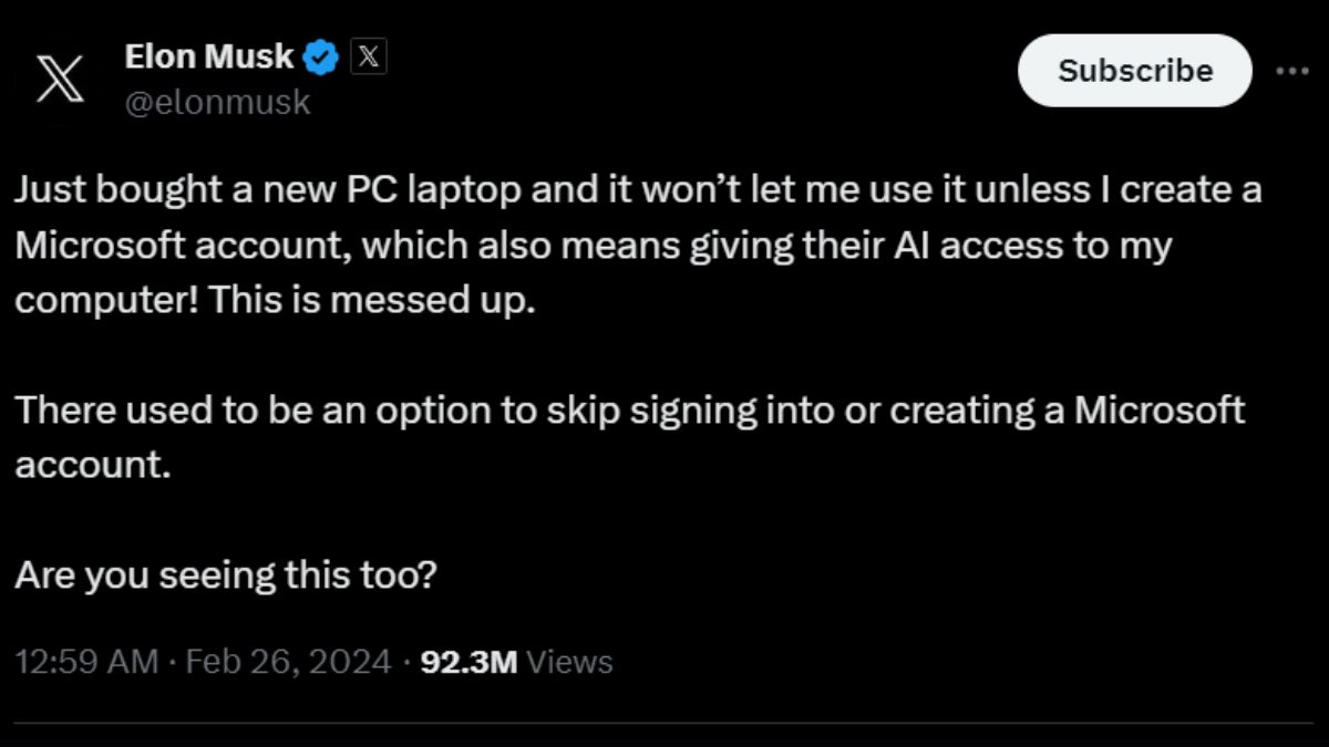मस्क की इस शिकायत पर फिलहाल सत्या नडेला की ओर से किसी तरह का जवाब सामने नहीं आया है। दरअसल, इससे पहले मस्क ने कहा था कि वे बिना अकाउंट क्रिएट किए पीसी का इस्तेमाल करना चाहते हैं।