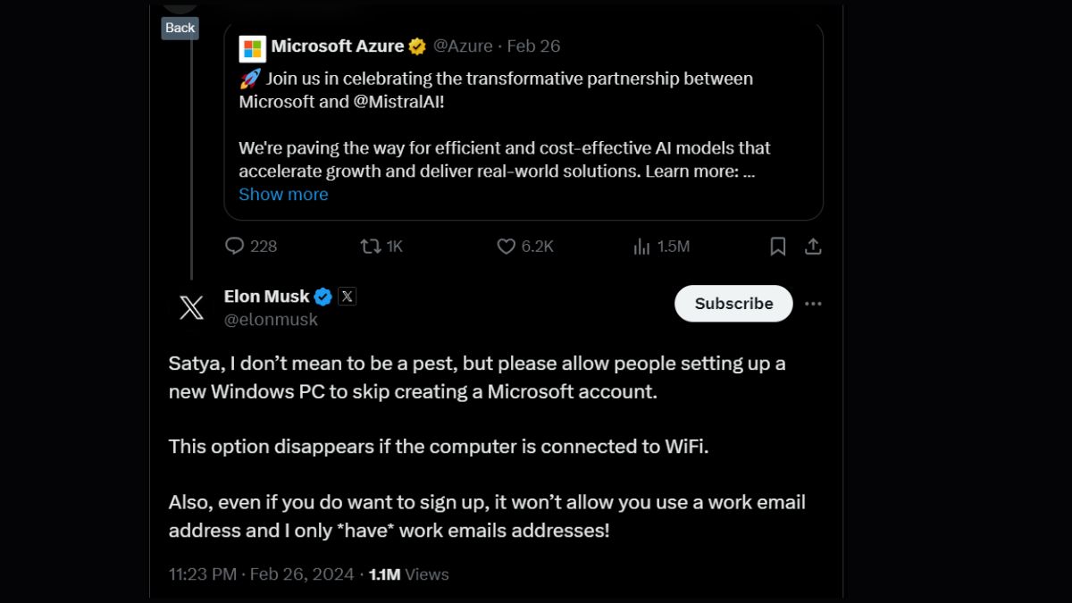 सत्या नडेला के एक पोस्ट पर मस्क ने रिप्लाई करते हुए लिखा है कि सत्या मेरा इरादा गलत नहीं है। कृपया आप नया विंडोज पीसी सेटअप करने वाले यूजर्स को माइक्रोसॉफ्ट अकाउंट बनाने की जरूरत को खत्म करें।
