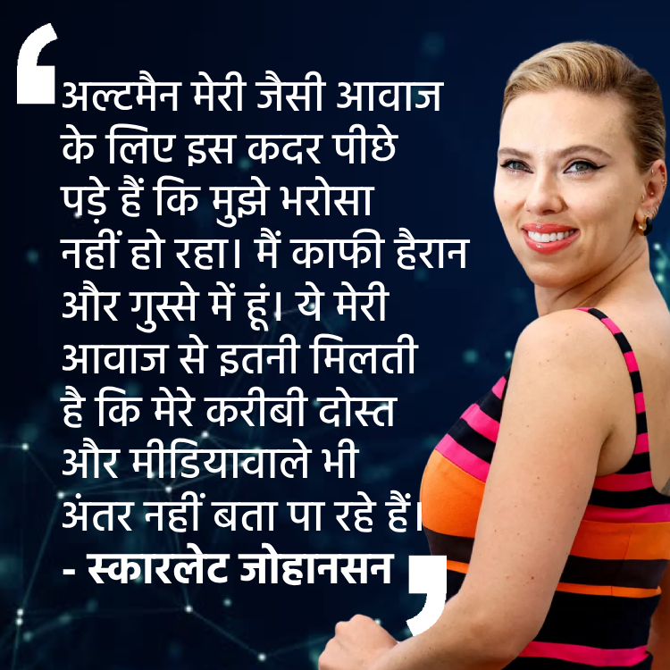 दरअसल, ओपनएआई पर हॉलिवुड एक्ट्रेस Scarlett Johansson ने लीगल एक्शन लिया है। Scarlett Johansson का कहना है कि चैटजीपीटी उनकी आवाज को कॉपी कर रहा है।