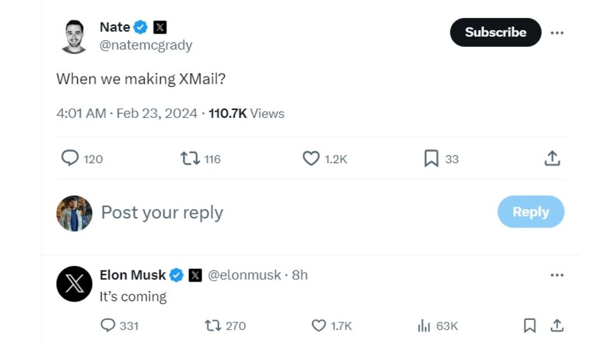 दरअसल, इन दिनों एलन मस्क एक ऐसा प्लेटफॉर्म लाने की तैयारी कर रहे हैं। जो गूगल के जीमेल की तरह ही काम करेगा। इस बात की पुष्टि खुद मस्क ने ही की है। एक यूजर ने X पोस्ट में पूछा कि हम Xmail कब बना रहे हैं इसका रिप्लाई देते हुए मस्क ने लिखा यह आ रहा है।