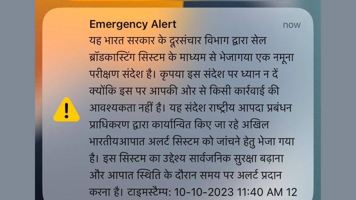 फोन में अचानक तेज बजी घंटी के बाद हर कोई सतर्क हो गया है। फोन पर भेजा गया यह अलर्ट एक इमरजेंसी टेस्ट अलर्ट था। यह अलर्ट भारत सरकार के दूरसंचार विभाग द्वारा सेल ब्रॉडकास्टिंग सिस्टम के माध्यम से भेजा गया है। इस अलर्ट को सैंपल टेस्टिंग कहा जा सकता है।
