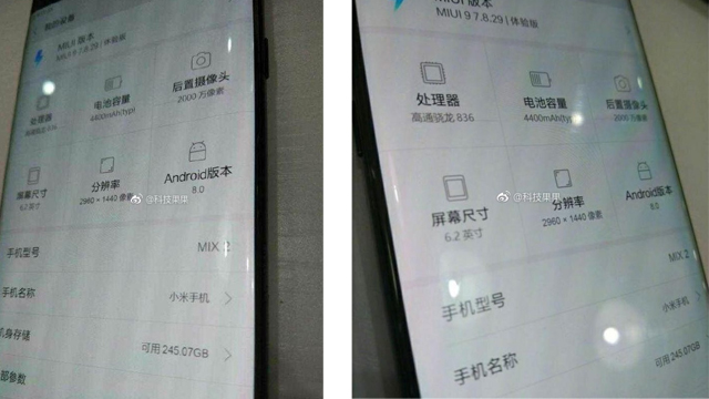 GizChina रिपोर्ट के मुताबिक, Weibo पर Mi Mix 2 की दो नई फोटोज सामने आई हैं। फोटोज के मुताबिक, यह फोन एंड्रॉयड 8.0 Oreo पर काम करेगा जिसपर MIUI 9 की स्कीन दी गई है। यह फोन स्नैपड्रैगन 836 चिपसेट से लैस होगा। अगर ऐसा होता है तो यह दुनिया का पहला फोन होगा जो क्वालकॉम स्नैपड्रैगन के लेटेस्ट प्रोसेसर के साथ आएगा। साथ ही इसमें 4000 एमएएच की बैटरी दी गई होगी। इसमें 6.2 इंच का एमोलेड डिस्प्ले दिया गया होगा जिसका पिक्सल रेजोल्यूशन 2960x1440 है। फोटोग्राफी के लिए इसमें 20 मेगापिक्सल का रियर कैमरा दिया जा सकता है।