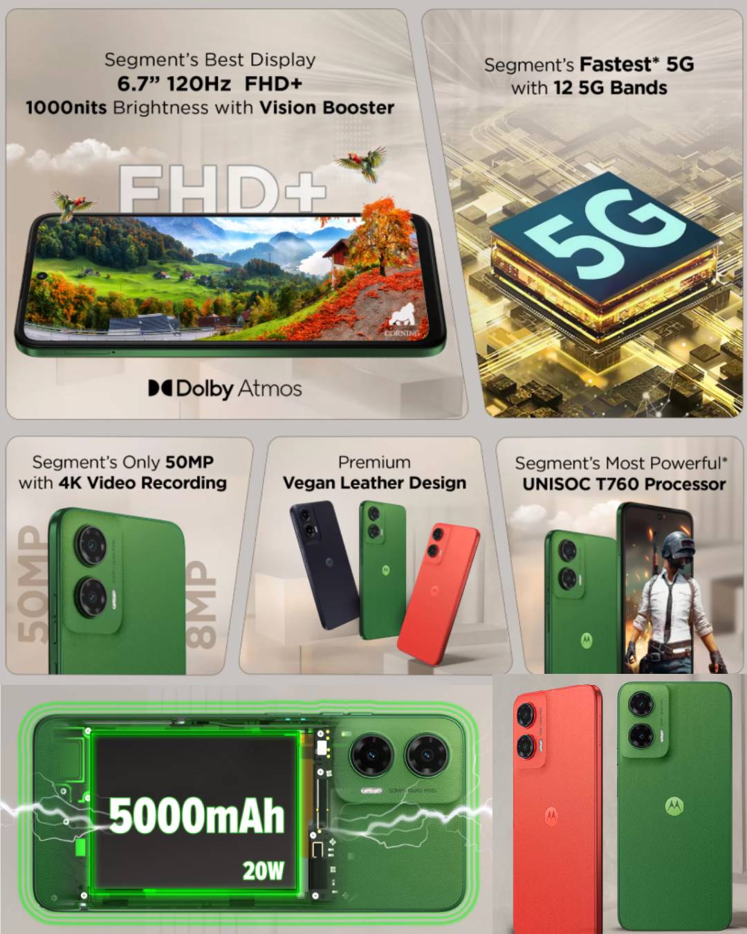 Moto G35 5G कल पहली सेल पर आने वाला है। फोन को ग्राहक ऑनलाइन शॉपिंग साइट फ्लिपकार्ट और कंपनी की ऑफिशियल साइट के अलावा सभी रिटेल पार्टनर्स से खरीद पाएंगे। फोन के 4GB रैम और 128GB स्टोरेज की कीमत 9,999 रुपये है। इसमें तीन मिडनाइट ब्लैक, लीफ ग्रीन और गुवावा रेड जैसे तीन कलर ऑप्शन मिलते हैं। फ्लिपकार्ट एक्सिस बैंक क्रेडिट कार्ड से पेमेंट करने पर 5 प्रतिशत कैशबैक का लाभ मिलेगा। जिससे इसकी प्रभावी काफी कम हो जाएगी। इस पर EMI ऑप्शन भी दिया जा रहा है।