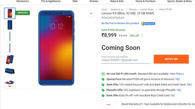 Lenovo K9 और Lenovo A5 को भी फ्लिपकार्ट पर धमाका डेज सेल के तहत उपलब्ध कराया जाएगा। Lenovo K9 की कीमत की बात करें तो इसके 3 जीबी रैम और 32 जीबी स्टोरेज वेरिएंट की कीमत 8,999 रुपये है। इसे ब्लैक और ब्लू कलर वेरिएंट में खरीदा जा सकेगा। वहीं, Lenovo A5 को दो वेरिएंट में पेश किया गया है। इसका पहला वेरिएंट 2 जीबी रैम और 16 जीबी स्टोरेज से लैस है। इसकी कीमत 5,999 रुपये है। वहीं, दूसरा वेरिएंट 3 जीबी रैम और 32 जीबी स्टोरेज से लैस है। इसकी कीमत 6,999 रुपये है। दोनों ही वेरिएंट ब्लैक और फाइन गोल्ड कलर वेरिएंट में बेचे जाएंगे। यूजर्स इन्हें नो कॉस्ट ईएमआई के तहत भी खरीद सकते हैं। ग्राहक एक्सिस बैंक का कार्ड इस्तेमाल कर 10 फीसद का इंस्टैंट डिस्काउंट और फोनपे से पेमेंट कर 10 फीसद कैशबैक का लाभ उठा सकते हैं। यह फोन फिलहाल कमिंग सून दिखा रहा है।