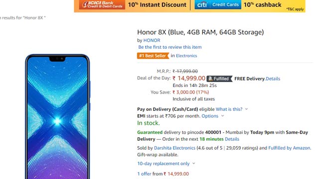 Honor 8X को 14,999 रुपये की शुरुआती कीमत में पेश किया गया है। इसे अमेजन पर उपलब्ध कराया गया है। इसके 4 जीबी रैम और 64 जीबी स्टोरेज वेरिएंट की कीमत 14,999 रुपये है। वहीं, 6 जीबी रैम और 64 जीबी स्टोरेज वेरिएंट की कीमत 16,999 रुपये और 6 जीबी रैम समेत 128 जीबी स्टोरेज वेरिएंट की कीमत 18,999 रुपये है। इस फोन के सभी वेरिएंट्स को ब्लैक, रेड और ब्लू कलर में उपलब्ध कराया जाएगा। लॉन्च ऑफर के तहत एयरटेल यूजर्स को 1 टीबी डाटा बेनिफिट्स दिए जाएंगे। अगर ग्राहक ICICI बैंक का कार्ड इस्तेमाल करते हैं तो उन्हें 10 फीसद का इंस्टैंट डिस्काउंट दिया जाएगा। साथ ही Citi बैंक का कार्ड इस्तेमाल करने पर 10 फीसद कैशबैक भी दिया जाएगा।