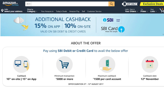 अमेजन: अगर ग्राहक एसबीआई के डेबिट और क्रेडिट का इस्तेमाल करते हैं तो उन्हें 15 फीसद एप के जरिए और 10 फीसद वेबसाइट के जरिए ऑफ दिया जाएगा। इसके लिए न्यूनतम खरीदारी 5,000 रुपये या उससे ज्यादा की होनी चाहिए। प्रत्येक कार्ड पर 1,500 रुपये तक ही कैशबैक दिया जाएगा। साथ ही यह कैशबैक 12 नवंबर तक ग्राहक के अकाउंट में क्रेडिट कर दिया जाएगा। साथ ही अमेजन पे में बैलेंस रखने पर 15 फीसद का कैशबैक दिया जाएगा।