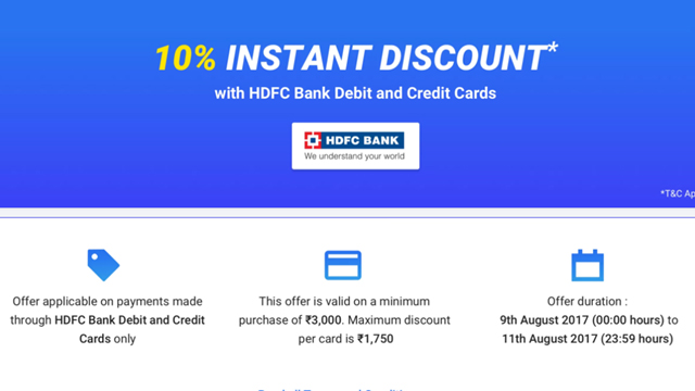 फ्लिपकार्ट: अगर ग्राहक एचडीएफसी के क्रेडिट व डेबिट कार्ड से पेमेंट करते हैं तो उन्हें 10 फीसद का अतिरिक्त डिस्काउंट दिया जाएगा। इसके लिए न्यूनतम खरीदारी 3,000 रुपये या उससे ज्यादा की होनी चाहिए। प्रत्येक कार्ड पर 1,750 रुपये तक ही कैशबैक दिया जाएगा।