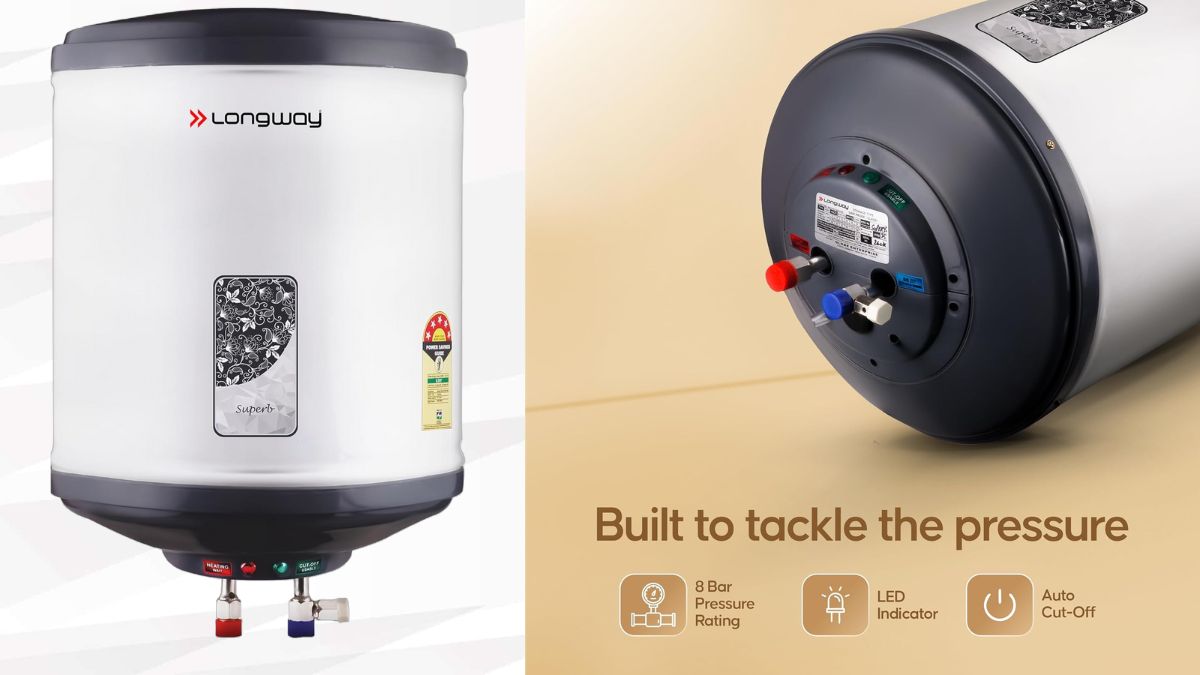 Longway की तरफ से पेश किए जाने वाले Superb गीजर को अमेजन से 2,889 रुपये में खरीदा जा सकता है। इस गीजर की कैपिसिटी 10 लीटर की है। इसे 5 स्टार रेटिंग मिली हुई है। वॉटर गीजर मल्टीपल सेफ्टी सिस्टम और एंटी रस्ट कॉटिंग के साथ आता है। गीजर को स्टेनलैस स्टील से तैयार किया गया है।