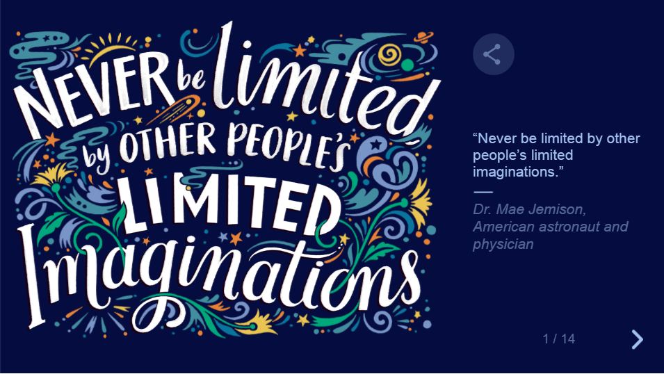 सबसे पहले स्लाइड में आपको अमेरिकी एस्ट्रोनॉट एवं फिजिशियन मे जेमिशन का प्रेरणादायक कोट दिखाई देगा। इसमें लिखा है, 'कभी भी दूसरे लोगों की सीमित कल्पनाओं तक सीमित न रहें।'