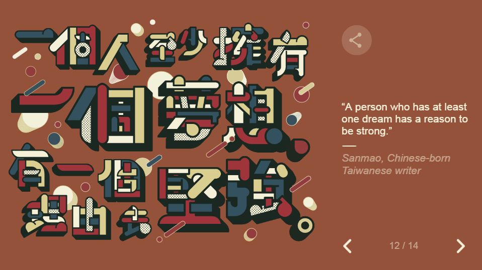बारहवीं स्लाइड में ताइवानी लेखिका सनमाओ ने लिखा है, 'एक व्यक्ति जिसके पास कम से कम एक सपना है, उसके मजबूत होने का एक कारण है।'