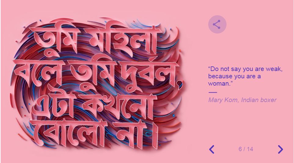 नई दिल्ली (टेक डेस्क)। Google ने हर बार की तरह इस बार भी खास अंतर्राष्ट्रीय महिला दिवस जैसे खास मौके पर एक अनोखा Doodle बनाया है। Google ने अपने इस Doodle के फ्रंट में 11 भाषाओं में महिला शब्द को दर्शाया है। जैसे ही आप इस पर क्लिक करते हैं तो आपको दुनिया की 13 सशक्त महिलाओं के प्रेरणादायक कोट्स दिखाई देंगे। हर स्लाइड में आपको अलग-अलग भाषाओं में सशक्त महिलाओं के कोट्स उनके नाम के साथ दिखाई देंगे।