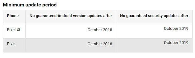 पेज के अनुसार, पिक्सल और पिक्सल XL स्मार्टफोन में एंड्रायड वर्जन अपडेट इस साल अक्टूबर तक मिलेंगी। जबकि इस अवधि के बाद "कोई गारंटी एंड्रायड वर्जन अपडेट्स" नहीं होगा। सिक्योरिटी अपडेट के लिए, पिक्सल और पिक्सल XL स्मार्टफोन में अक्टूबर 2019 के बाद कोई गारंटी सिक्योरिटी अपडेट नहीं मिलेगा।