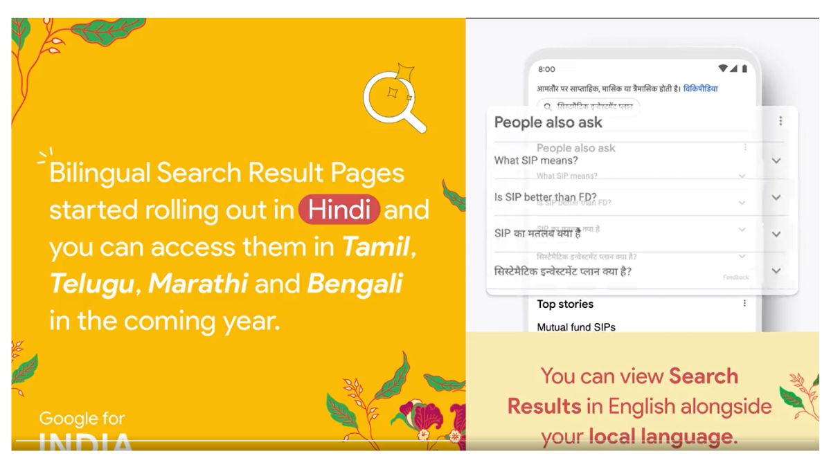 इसके साथ ही गूगल ने एक ऐसी सुविधा भी पेश की है, जिसे अभी केवल भारत-में लाया गया है, जहां सर्च रिजल्ट पेज उन यूजर्स के लिए दो भाषाओं मे आ जाएंगे, जो इसे पसंद करते हैं।Google का कहना है कि वह इसके लिए अपने एडवांस मशीन लर्निंग-आधारित ट्रांसलेशन मॉडल" और "एक क्रॉस-लैंग्वेज सर्च तकनीक पर निर्भर करेगा। यह फंक्शनालिटी पहले ही हिंदी में शुरू हो चुकी है और आने वाले वर्ष में तमिल, तेलुगु, मराठी और बंगाली सहित अन्य भारतीय भाषाओं में भी इसका विस्तार किया जाएगा।