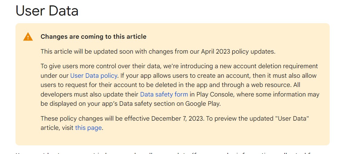 Google ने कहा कि डेवलपर्स को 7 दिसंबर तक अपने ऐप के डेटा सिक्योरिटी फॉर्म में नए Data Deletion प्रश्नों के उत्तर प्रस्तुत करने की आवश्यकता है। इसके बाद (अगले साल की शुरुआत में), Google Play यूजर को ऐप की स्टोर लिस्ट बदलाव देख पाएंगे।