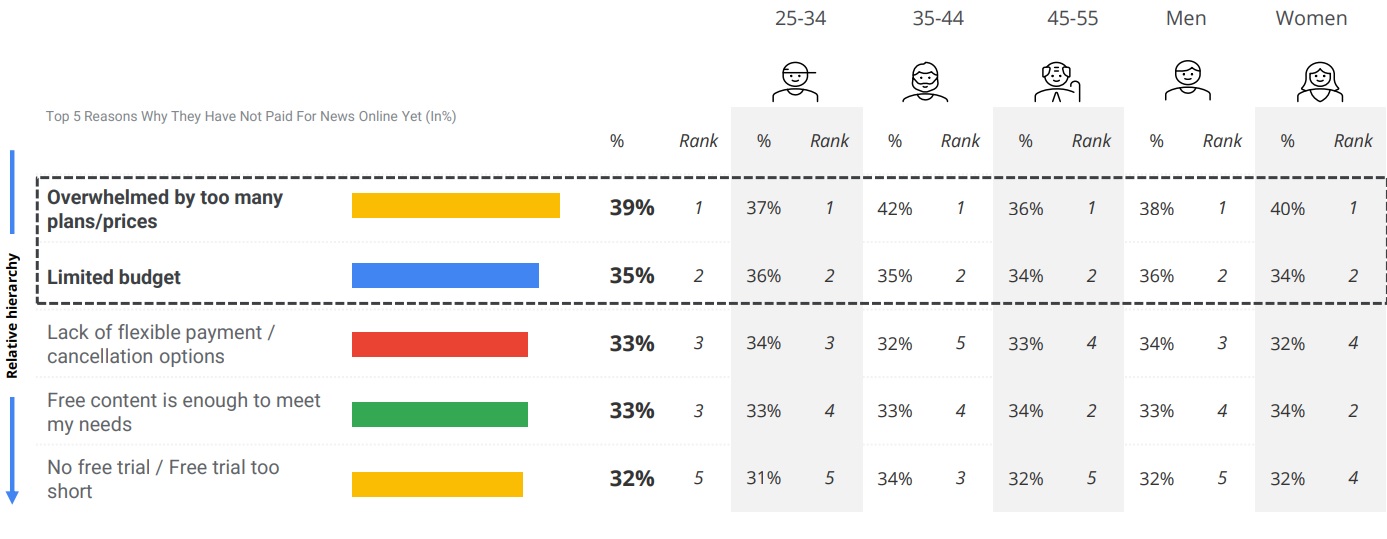 इसके साथ ही यूजर्स के लिए पर्सनलाइज्ड सब्सक्रिप्शन विकल्प का अभाव भी बड़ी परेशानी है। अधिकतर न्यूज वेबसाइट अपने पूरे कंटेंट का सब्सक्रिप्शन ऑफर करते हैं। कुछ यूजर्स सिर्फ अपनी पसंद की खबरों के लिए पैसा देना चाहते हैं। इसके साथ ही यूजर्स चाहते हैं कि उनका सब्सक्रिप्शन फ्लैक्सीबल हो और वे जब चाहे इसे कैंसिल करवा पाएं।