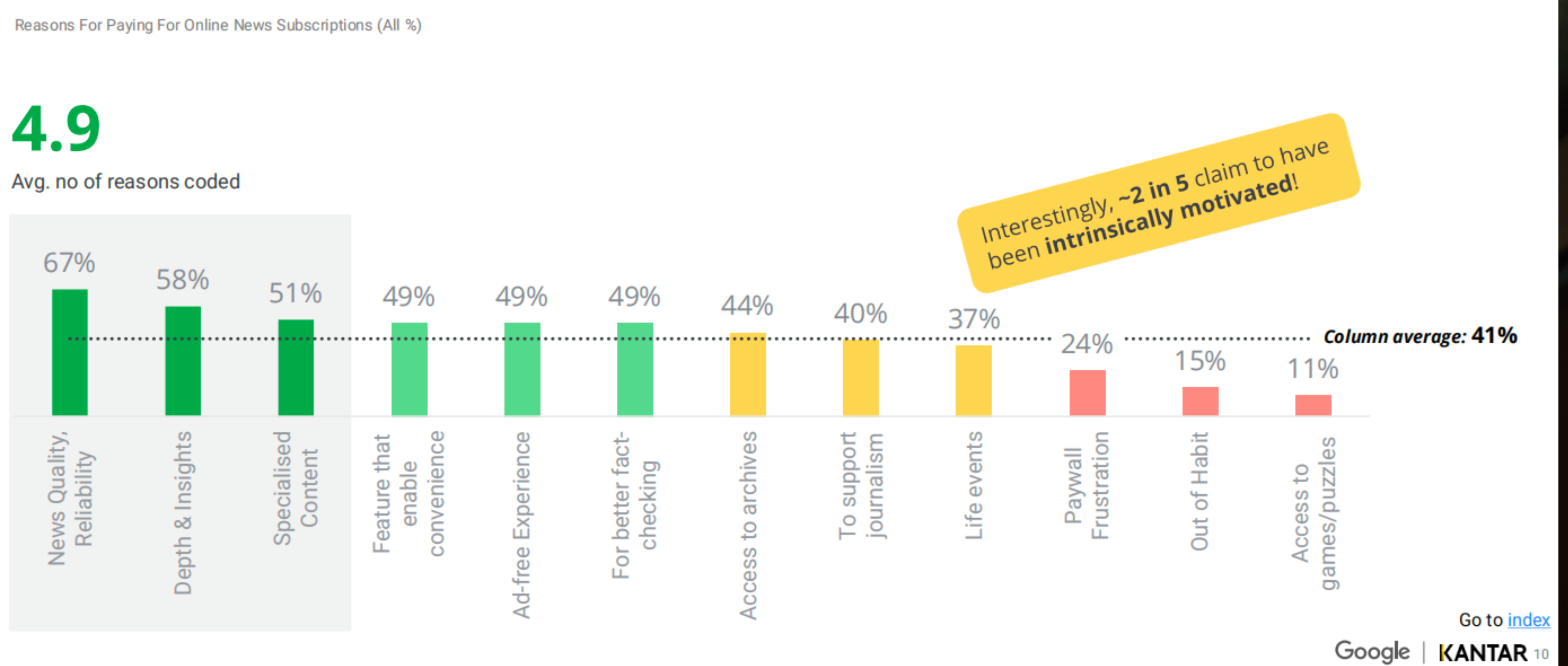 51 फीसदी पाठक स्पेशलाइज्ड कंटेंट के लिए पैसा देना चाहते हैं। मिसाल के लिए, अगर कोई हेल्थ का आर्टिकल है, तो रीडर चाहते हैं कि उन्हें आर्टिकल में जानकारी किसी हेल्थ एक्सपर्ट यानी डॉक्टर के हवाले से हो। इसी तरह शेयर मार्केट से जुड़ी खबरों में वे सेबी रजिस्टर्ड एनालिस्ट का हवाला चाहते हैं।