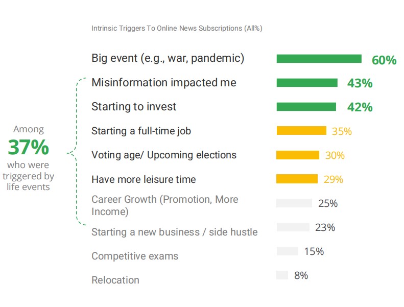 दिल्ली की 30 साल की एक महिला बताती हैं कि उन्हें कोरोना महामारी के दौरान मैंने हेल्थ से जुड़ी खबरों का अपडेट पाने के लिए एक ऑनलाइन न्यूज प्लेटफॉर्म का सब्सक्रिप्शन लिया। मुझे उनकी खबरें काफी पसंद आई और मैंने महामारी के बाद सब्सिक्रिप्शन जारी रखा। इस तरह के करीब 60 फीसदी रीडर हैं, जो महामारी या युद्ध जैसी बड़ी घटनाओं की विस्तृत रिपोर्ट के लिए सब्सक्रिप्शन लेना चाहते हैं।