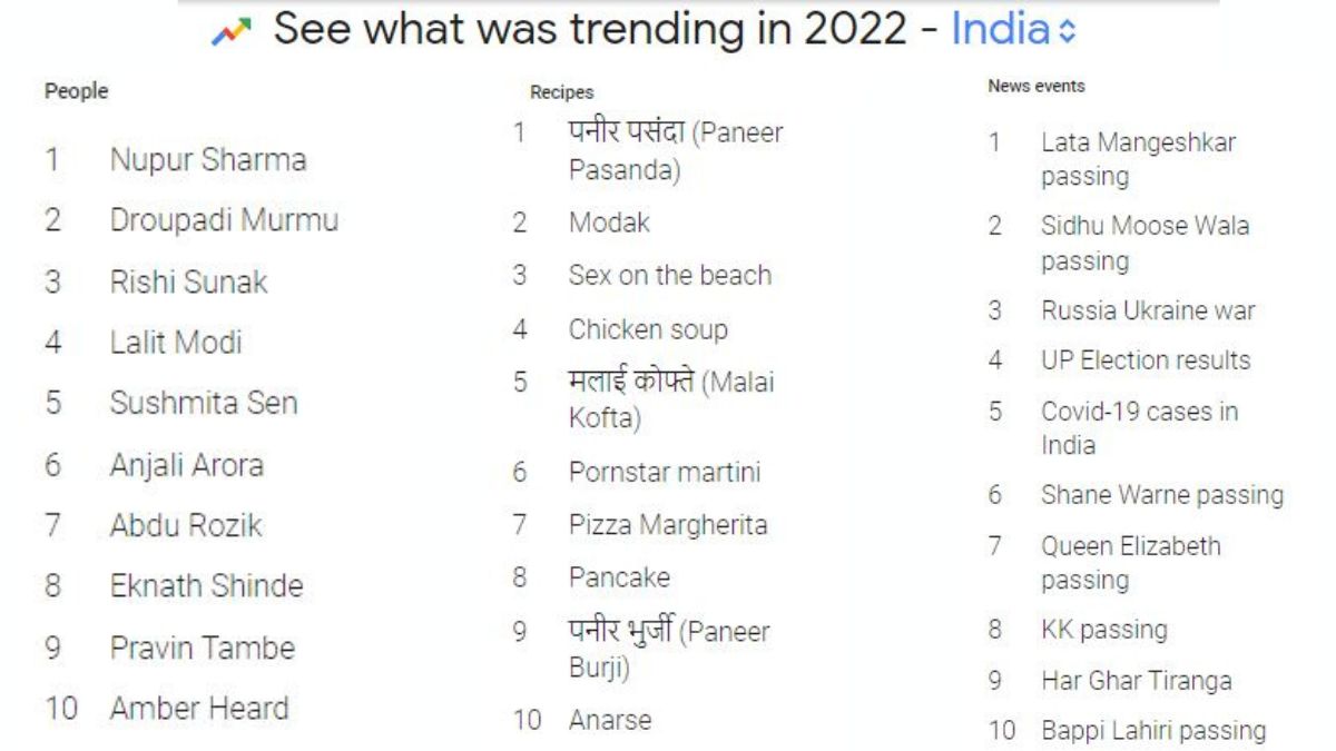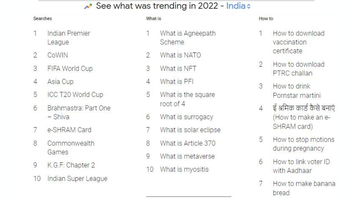गूगल ने जो लिस्ट पेश की है, उसमें कंपनी ने टॉप 10 टॉपिक बताए गए हैं। इस लिस्ट की पहली कटैगरी Searches है, जिसमें Indian Premier League, CoWIN, FIFA World Cup, Asia Cup, ICC T20 World Cup, Brahmastra: Part One – Shiva, e-SHRAM Card, Commonwealth Games, K.G.F: Chapter 2 और Indian Super League शामिल हैं।