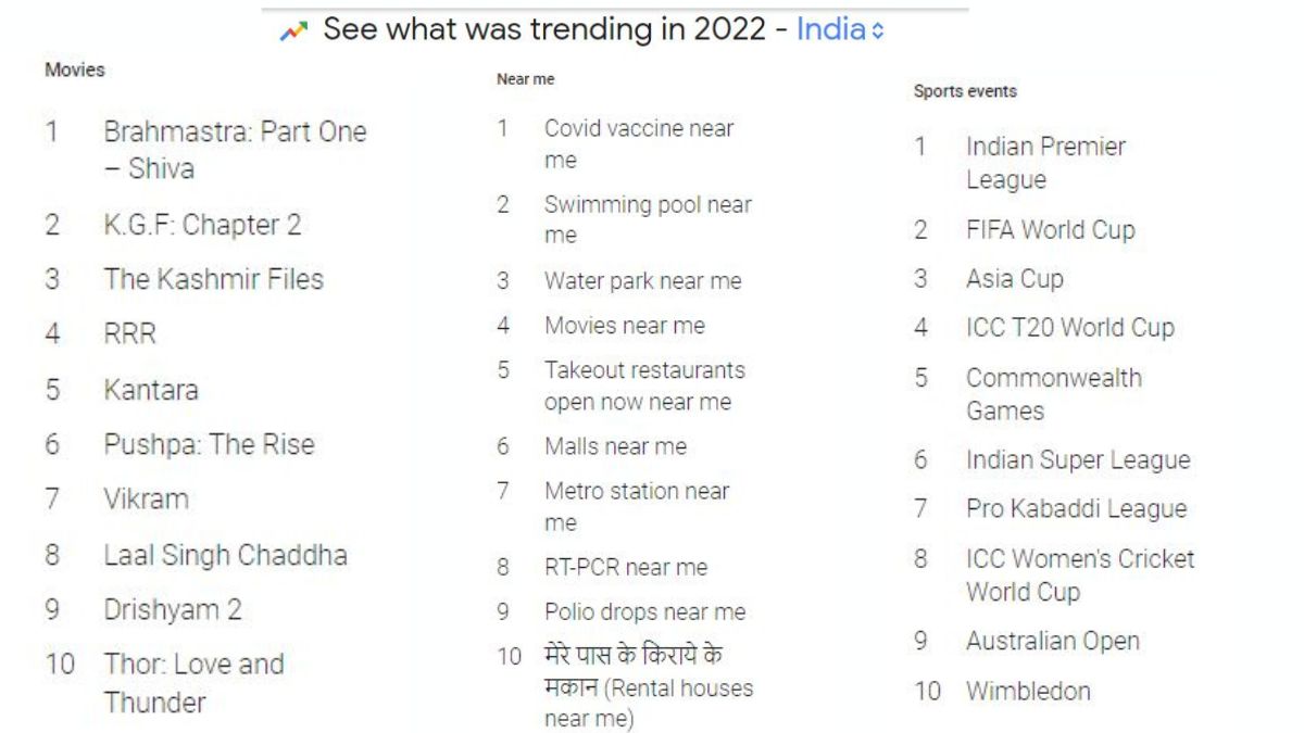 गूगल ने movies को भी इन कटैगरी में शामिल किया है। इसमें Brahmastra: Part One – Shiva, K.G.F: Chapter 2, The Kashmir Files, RRR, Kantara, Pushpa: The Rise, Vikram, Laal Singh Chaddha, Drishyam 2 और Thor: Love and Thunder शामिल हैं। इसके अलावा गूगल ने Near me, News Event, Sports Events, people और रेसिपी कटैगरी में भी टॉप सर्च की लिस्ट पेश की है।