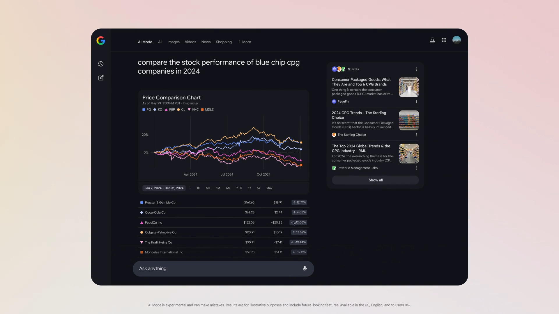 गूगल ने अपने ब्लॉग में इस फीचर को टीज करते हुए शॉर्ट वीडियो जारी किया है। उसमें यूजर एआई मोड में 2024 में ब्लू चिप कंपनियों के स्टॉक परफॉर्मेंस को कम्पेयर करने का प्रॉम्प्ट डालता है। इसके बाद एआई मॉडल अलग अलग कंपनियों के स्टॉक प्राइस को इंटरेक्टिव चार्ट के साथ-साथ टेक्स्ट और टेबल फॉर्मेट में शो करता है। इसके साथ ही यूजर्स इस डेटा से जुड़े और भी प्रश्न एआई से पूछ सकते हैं।