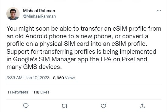 अभी Android यूजर्स को अपनी eSIM प्रोफाइल को एक फोन से दूसरे फोन में आसानी से ट्रांसफर करने की अनुमति नहीं देता है। उसके लिए यूजर्स को अपने पुराने फोन पर eSIM प्रोफाइल को डीएक्टिवेट करके अपने नए फोन पर इसे फिर से एक्टिवेट करना पड़ता। यह प्रक्रिया न केवल जटिल है बल्कि यूजर्स को अपने नए फोन पर eSIM को सक्रिय करने के लिए अपने वाहक से भी संपर्क करना पड़ सकता है।