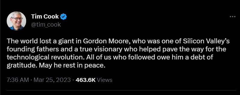 मूर सिलिकॉन वैली में एक प्रभावशाली व्यक्ति के रूप में माने जाते थे। एपल के सीईओ टिम कुक (Apple CEO Tim Cook ) और गूगल के सीईओ सुंदर पिचाई (Google CEO Sundar Pichai ) ने उन्हें याद करते हुए ट्विटर पर पोस्ट शेयर किया है।
