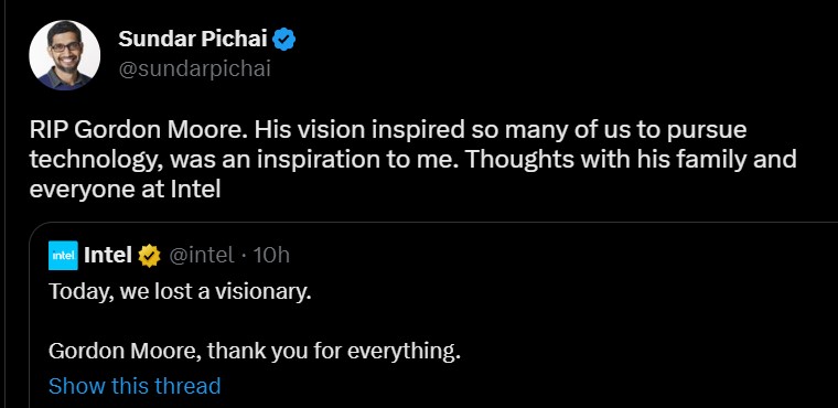 इंटेल के सीईओ पैट जेलसिंगर ने मूर के निधन को लेकर एक बयान जारी करते हुए कहा कि, 'गॉर्डन मूर प्रौद्योगिकी उद्योग के अग्रणी थे और उनका योगदान आने वाली पीढ़ियों के लिए दुनिया को आकार देने में अहम भूमिका अदा करेगा। हम उनके नेतृत्व, उनकी दृष्टि और कंप्यूटिंग के क्षेत्र को आगे बढ़ाने के लिए उनकी अटूट प्रतिबद्धता के लिए आभारी हैं।