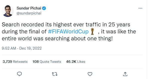 अल्फाबेट और गूगल के CEO सुंदर पिचाई ने सोमवार यानी 19 दिसंबर को अपने आधिकारिक ट्विटर पोस्ट में बताया कि फीफा विश्व कप फाइनल के दौरान गूगल सर्च ने अपने अस्तित्व के 25 सालों में अब तक का सबसे अधिक ट्रैफिक दर्ज किया। पिचाई ने ट्वीट किया कि #FIFAWorldCup के फाइनल के दौरान सर्च ने 25 साल में अब तक का सबसे ज्यादा ट्रैफिक दर्ज किया, ऐसा लगा जैसे पूरी दुनिया एक चीज के बारे में सर्च कर रही है।