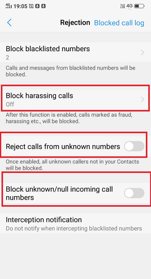 - यहां आपको तीन ऑप्शन दिखाई देंगे- ब्लॉक हैरेशिंग कॉल्स, रिजेक्ट कॉल्स फ्रॉम अननोन नंबर्स और ब्लॉक अननोन या नल इंकमिंग कॉल्स का ऑप्शन दिखाई देगा।