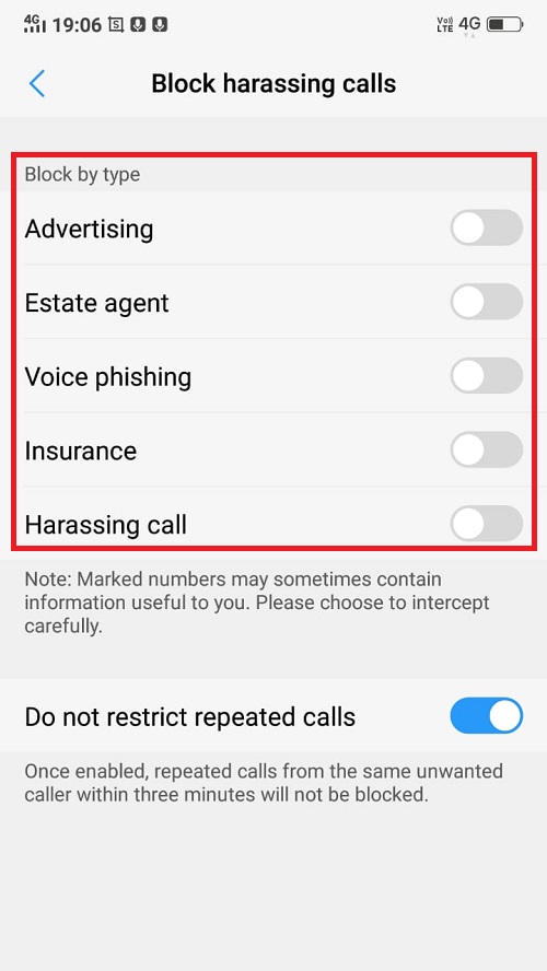 - आपको यहां ब्लॉक हैरेशिंग कॉल्स को इनेबल करने के लिए उसपर टैप करना होगा।