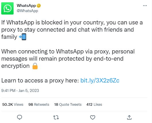 जब WhatsApp से सीधे कनेक्ट करना संभव न हो, तो आपके ऐप से प्रॉक्सी सर्वर के माध्यम से कनेक्ट कर सकते हैं। प्रॉक्सी का उपयोग करने से वॉटसऐप प्राइवेसी और सिक्योरटी फीचर में कोई बदलाव नहीं आता है। बता दें कि आपके पर्सनल मैसेज और कॉल अभी भी एंड-टू-एंड एन्क्रिप्टेड रहेंगे। इसका मतलब है कि वे आपके मैसेज अभी भी रिसीवर और आपके बीच में रहेंगे।