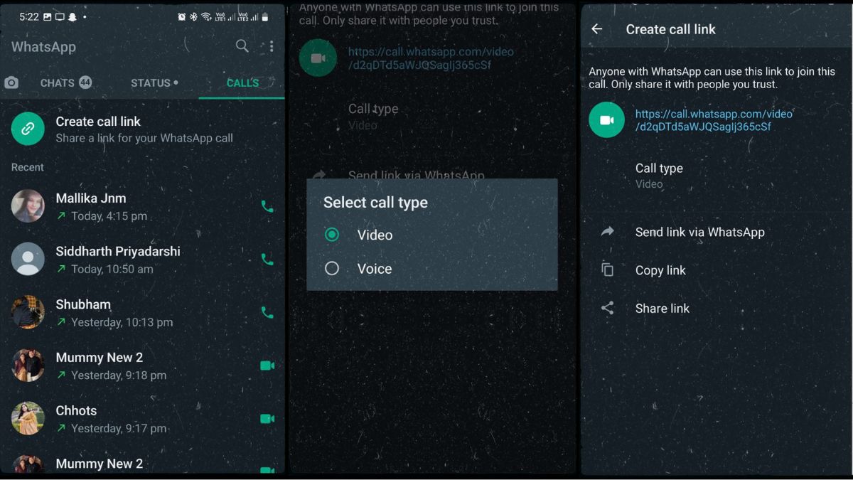 वॉट्सऐप कॉल लिंक फीचर आपको अपने कॉन्टेक्ट्स के साथ वॉयस या वीडियो कॉल लिंक बनाने और साझा करने की अनुमति देता है। लिंक खोलने के बाद यह आपके कॉन्टेक्ट्स को सक्रिय वॉयस या वीडियो कॉल से सीधे जोड़ देगा। आप कॉल लिंक को किसी व्यक्ति या वॉट्सऐप ग्रुप में साझा कर सकते हैं। यूजर लिंक को कॉपी भी कर सकते हैं और इसे अन्य प्लेटफॉर्म पर साझा भी कर सकते हैं। यहां हम आपको बता रहे हैं कि आप अपने मोबाइल फोन पर वॉट्सऐप वॉयस या वीडियो कॉल लिंक कैसे बनाकर साझा कर सकते हैं।
