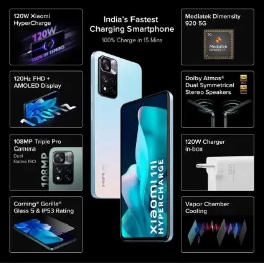 Xiaomi 11i Hypercharge 5G को अभी फ्लिपकार्ट पर 25,999 रुपये में लिस्ट किया गया है। कस्टमर्स चुनिंदा बैंक डेबिट और क्रेडिट कार्ड ऑफ़र के साथ फ़ोन की खरीद पर 2,000 रुपये की छूट पा सकते हैं। स्मार्टफोन मीडियाटेक डाइमेंसिटी 920 प्रोसेसर के साथ आता है और इसमें 4,500mAh की बैटरी है। कैमरा की बात करें तो डिवाइस में 108MP का प्राइमरी कैमरा और 16MP का सेल्फी शूटर है।
