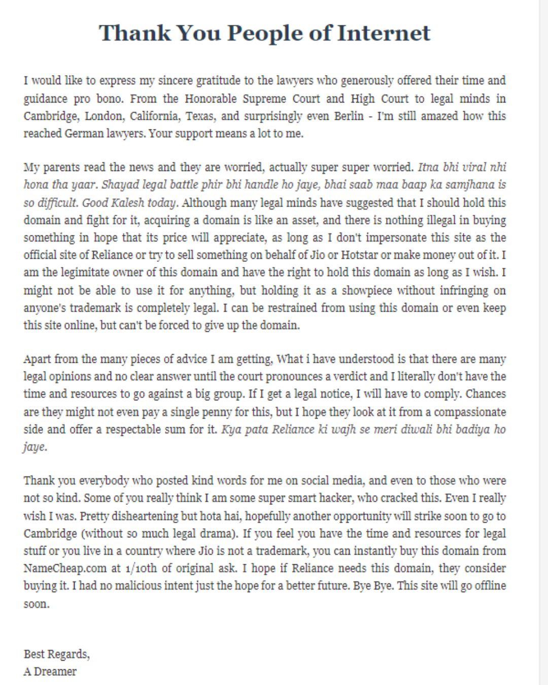 इस डेवलपर ने हाल ही में कहा कि '' मेरे माता-पिता आ रही खबरों को लेकर परेशान हैं। इतना भी वायरल नहीं होना था यार। शायद कानूनी लड़ाई फिर भी संभाल ली जाए, भाई साब मां बाप का समझौता बहुत मुश्किल है। आज का दिन शुभ हो। कुछ कानून के समझदार लोगों ने कहा कि मुझे इस डोमेन को अपने पास रखना चाहिए और इसके लिए लड़ना चाहिए, डोमेन प्राप्त करना एक संपत्ति की तरह है, और इस उम्मीद में कुछ खरीदना अवैध नहीं है।