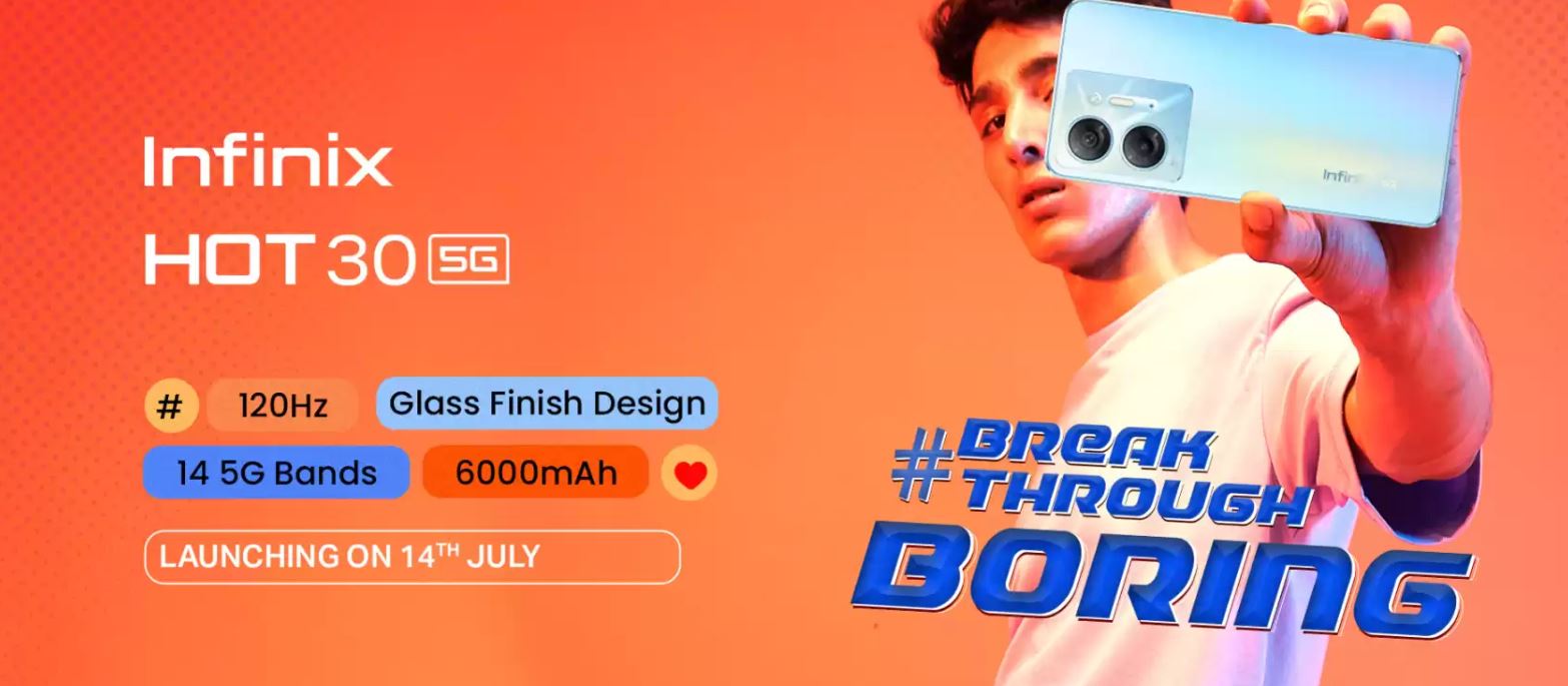 Time to #BreakThroughBoring with the all-new Infinix #Hot305G! Featuring a stunning design, kickass features, superfast performance & a whole lot more. Can you feel the HOTness kicking in already? The Hot 30 5G is launching on 14th July, 12 noon, only on Flipkart. Stay tuned! pic.twitter.com/6PfZhLhfeB
