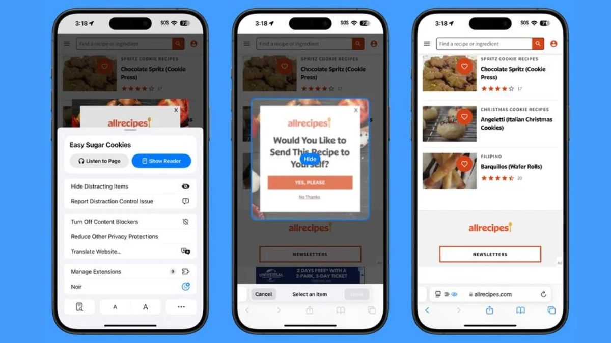 iOS 18 अपडेट ब्राउजिंग के बेहतर एक्सपीरियंस के लिए डिस्ट्रेक्शन कंट्रोल (Distraction Control) फीचर के साथ आता है। इस फीचर के साथ वेब पेज पर डिस्ट्रैक्ट करने वाले एलिमेंट्स को क्लीन अप किया जा सकेगा। इस फीचर के साथ लॉग-इन प्रॉम्प्ट और कंटेंट ओवरले को क्लीन किया जा सकता है। यूजर्स स्मार्ट सर्च फिल्ड के लिए पेज मेन्यू पर भी जा सकते हैं।