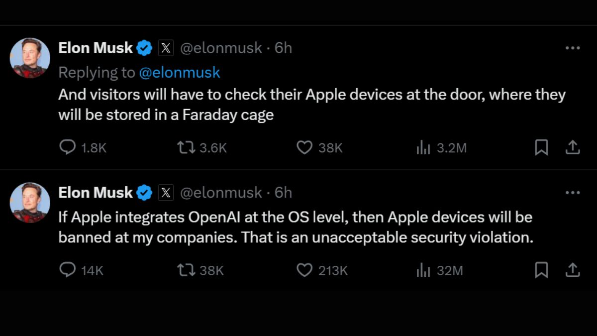 मस्क ने एक लेटेस्ट पोस्ट में लिखा है कि अगर एपल ओएस लेवल पर ओपनएआई को इंटीग्रेट करता है तो एपल डिवाइस का इस्तेमाल मेरी कंपनी में पूरी तरह बैन कर दिया जाएगा।