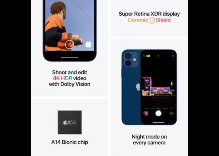 iPhone 12 में सुपर रेटिना XDR डिस्प्ले और सिरेमिक शील्ड ग्लास के साथ 6.1-इंच OLED डिस्प्ले पैनल है। ये हैंडसेट A14 बायोनिक चिपसेट के साथ आता है, जिसमें 256GB तक स्टोरेज ऑप्शन उपलब्ध है।