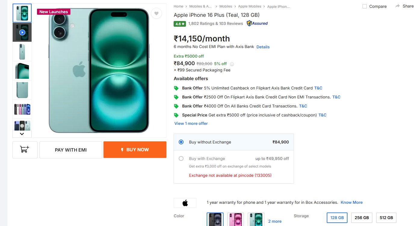 iPhone 16 Plus को भारत में एप्पल ने पिछले साल 89,900 रुपये की शुरुआती कीमत पर लॉन्च किया था। हालांकि अभी ये फोन Flipkart पर 5 हजार रुपये के फ्लैट डिस्काउंट के साथ लिस्टेड है, जिससे इसकी कीमत 84,900 रुपये रह गई है। डील को और भी शानदार बनाने के लिए Flipkart सभी बैंक क्रेडिट कार्ड ट्रांजेक्शन पर 4,000 रुपये की एक्स्ट्रा छूट भी दे रहा है। यानी आप फोन पर कुल 9 हजार रुपये तक की बचत कर सकते हैं।