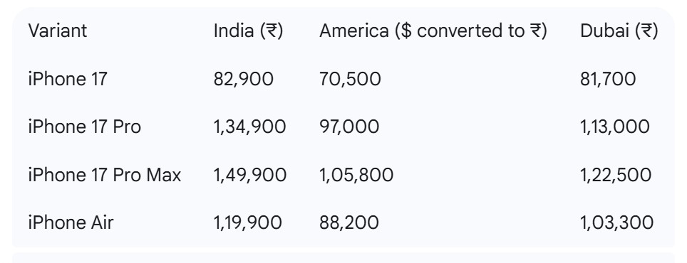 Apple ने भारत में iPhone 17 सीरीज और अल्ट्रा-थिन iPhone Air को बिक्री के लिए उपलब्ध करा दिया गया है। भारत में इनकी कीमत अमेरिका और कुछ देशों की तुलना में काफी ज्यादा रखी गई है। iPhone 17 का बेस मॉडल यहां 82900 रुपये से शुरू होता है जबकि अमेरिका में इसकी कीमत सिर्फ 799 डॉलर (लगभग 70466 रुपये) है।