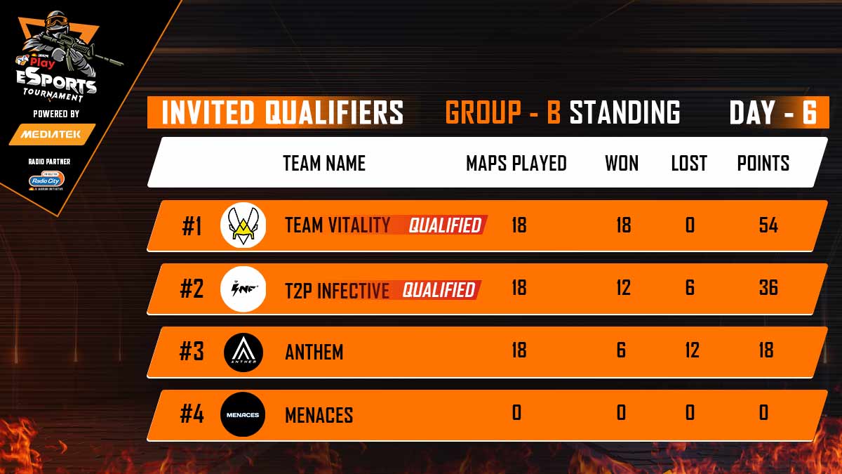 इस टूर्नामेंट में इन्वाइटेड क्वालीफायर ग्रुप का छठा मैच ग्रुप बी की टीम MENACES, Vitality, T2P infective और Anthem के बीच गुरुवार शाम 4 बजे से मैच खेला गया। मैच काफी रोमांचक रहा। इसका अंदाजा आप इसी बात से लगा सकते हैं कि टीम Vitality ने 18 जीत के साथ कुल 54 पॉइंट्स अर्जित किए। वहीं, ताबड़तोड़ फायरिंग करते हुए T2P infective दूसरे स्थान पर रही। इसने 12 जीत के साथ कुल 36 पॉइंट्स हासिल किए। वहीं, Anthem ने कुल 18 पॉइंट्स के साथ 12 मैच जीते। हालांकि, NS Official की स्थिति बहुत ही खराब रही। उन्होंने एक भी मैच नहीं जीता, जिसकी वजह से उनका पॉइंट्स भी जीरो रहा। अपने अच्छे प्रदर्शन की वजह से Vitality और T2P infective अगले मैच के लिए क्वालीफाई कर लिया है।