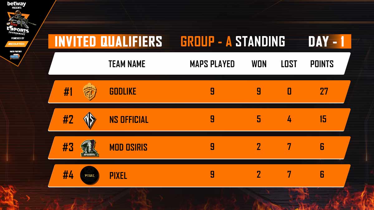 बात करें स्कोर की तो 9 जीत और 27 पॉइंट्स के साथ Godlike पहले स्थान पर रही। जबकि 5 जीत और 15 पॉइंट्स के साथ NS - Official दूसरे स्थान पर रही। MOD - Osiris और Pixel 2-2 जीत और 6-6 पॉइंट्स के साथ क्रमश: तीसरे और चौथे स्थान पर रही।